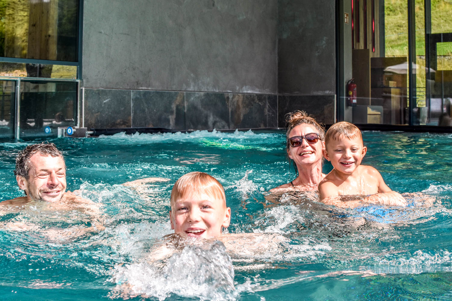 1. Stock: Familienbereich mit Innen-(30°) und Außenpool (34°), gemütlicher Ruhebereich, Sonnenterrasse, Panoramabar, Tee- und Saftbar, Duschen, Umkleiden, WC